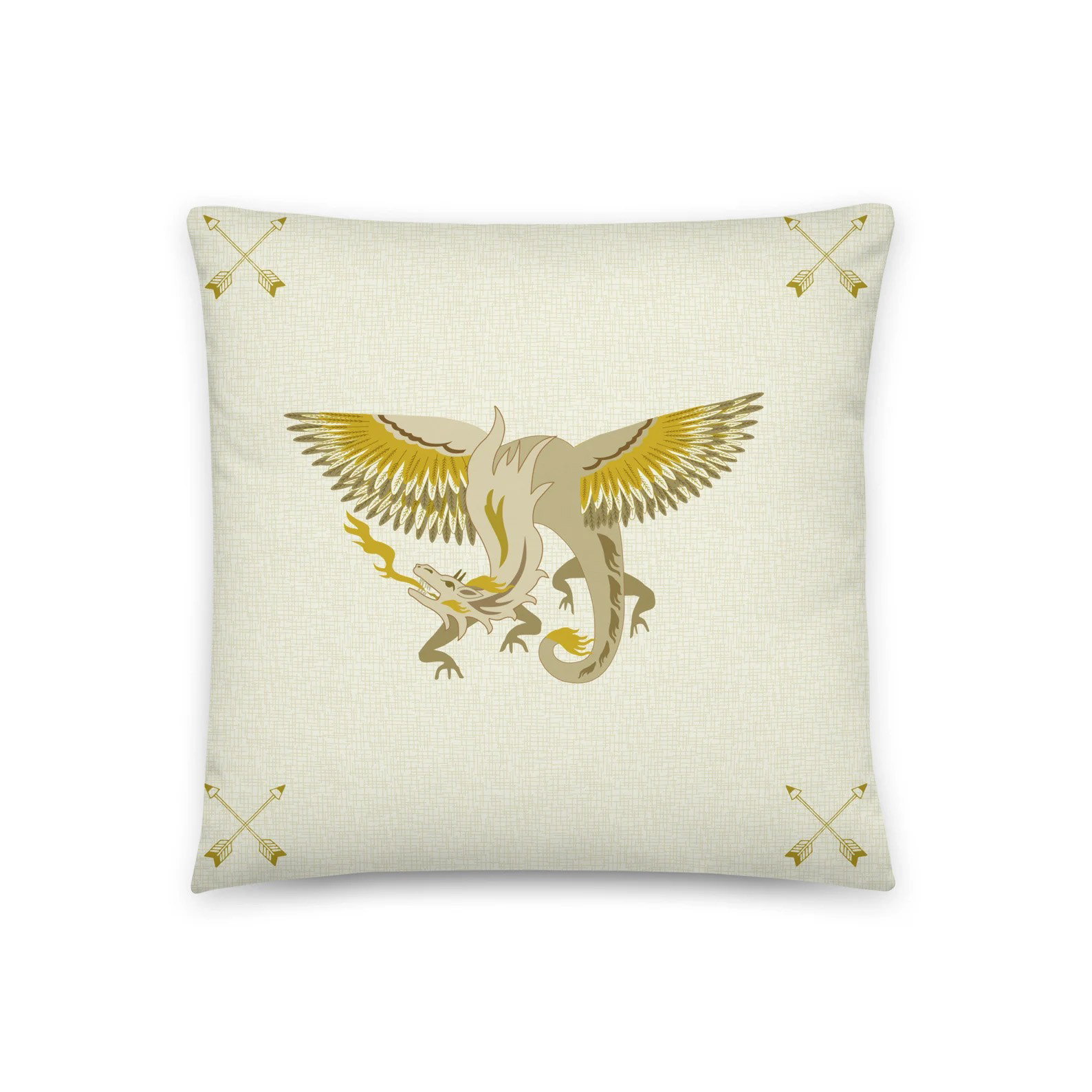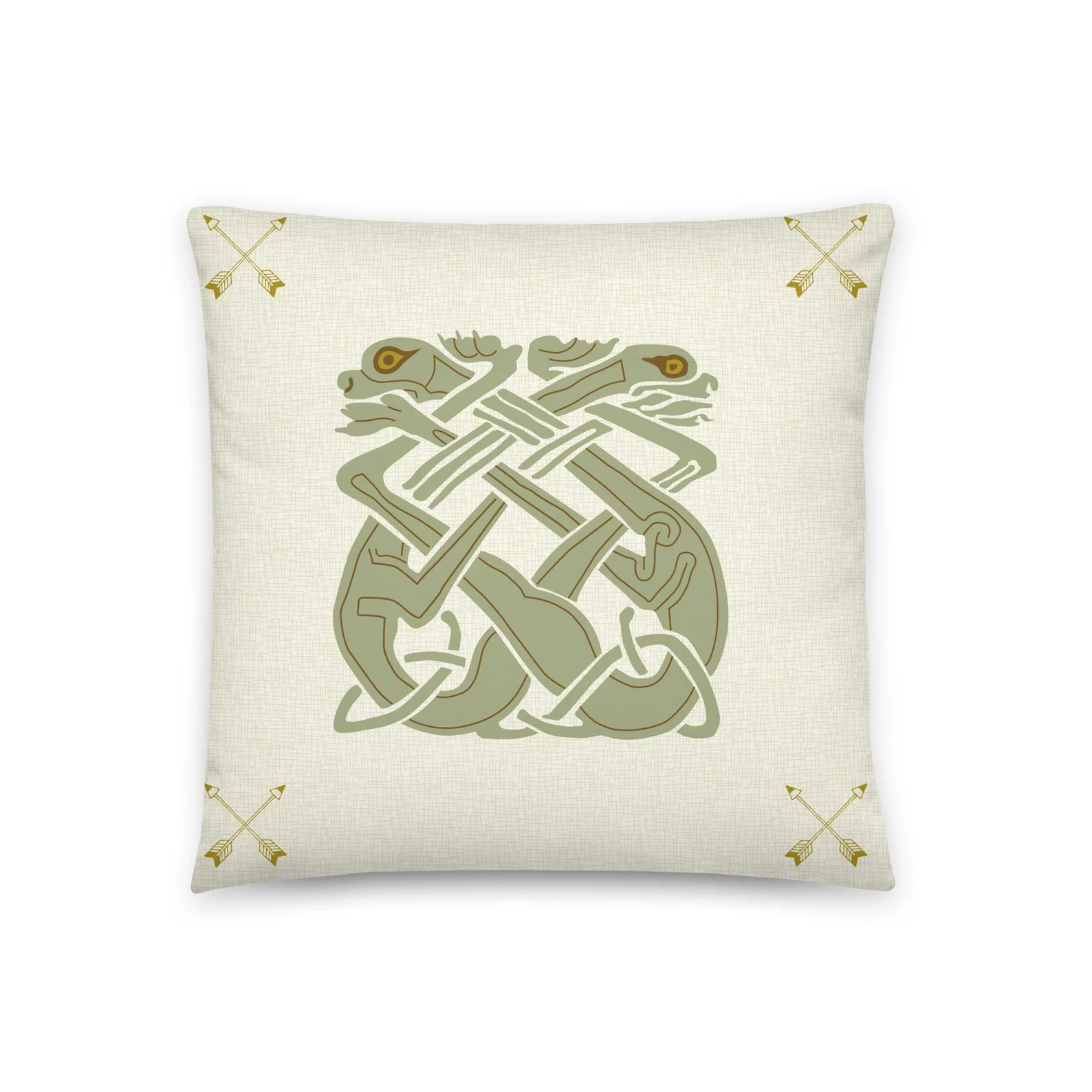 Decorative pillows with dragons and Celtic symbols. In two sizes 18 x 18 inches and 22 x 22 inches. Made to order. The pillow back has a Celtic Knot and flower pattern in green with the Birdflower Poet Label.